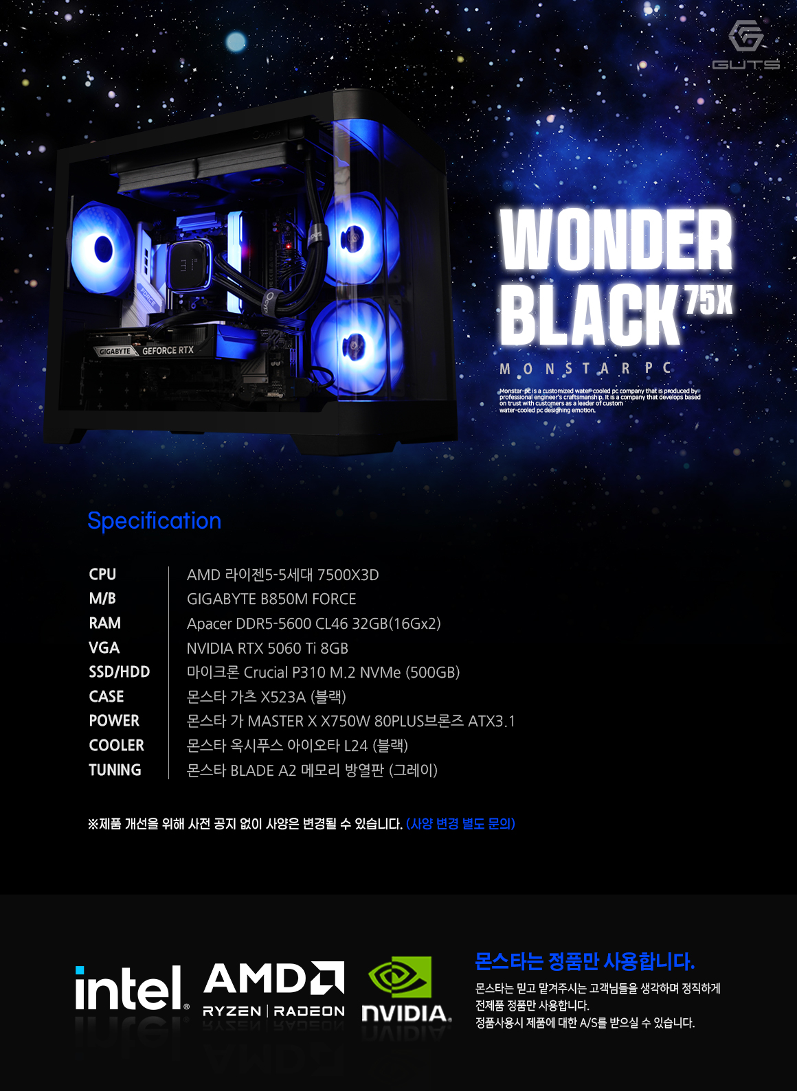 [즉시출고]몬스타 PC AMD 라이젠5 7500X3D RTX 5060 Ti 32G 게이밍 컴퓨터 원더 블랙75X