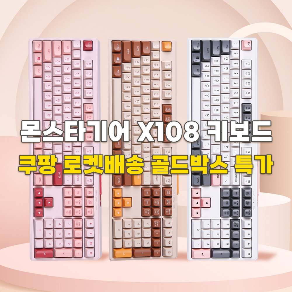 쿠팡의 골드박스는 매일 아침 7시 새로운 상품이 공개되는 로켓배송 전용 특가 프로모션으로, 단 24시간 동안 한정된 가격에만 만나볼 수 있는 것이 특징이다. 이번 행사에 포함된 몬스타기어 X108 키보드는 부드러운 타건감을 구현하는 풀윤활 설계와 조용한 키감으로 주목받아온 제품이다. 특히, 딸기샤베트·피치요거트·오트밀아몬드 등 세 가지 개성 있는 컬러로 출시돼 취향에 따라 선택할 수 있다.