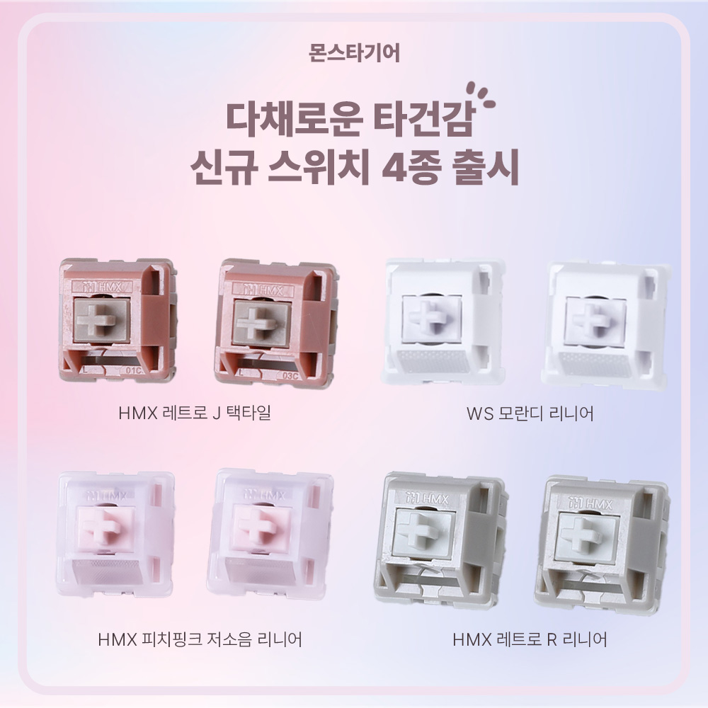 몬스타기어 관계자는 “이번에 출시한 스위치 4종은 각기 다른 매력의 타건음과 타건감을 극대화한 제품들”이라며, “HMX와 WS의 고품질 스위치를 통해 자신만의 키보드를 커스텀하는 즐거움을 만끽하시길 바란다”라고 전했다.