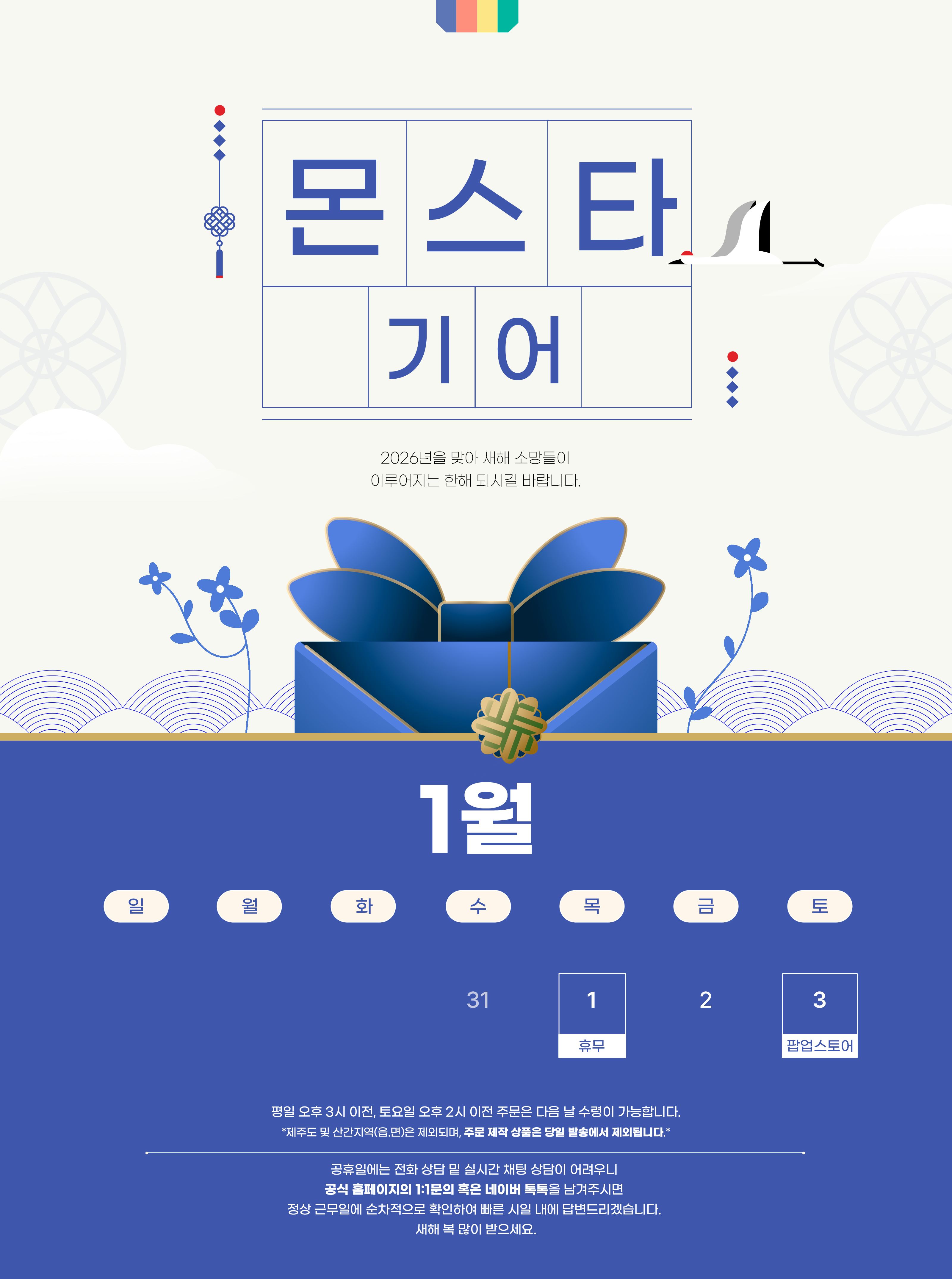커스텀 키보드와 혁신적인 입력기기인 몬스타덱을 통해 시장을 선도하고 있으며, 몬스타기어 브랜드로 게이밍 기어, 커스텀 수랭 쿨러, AI 딥러닝 등 하이엔드 PC 제조에 특화된 기업 몬스타주식회사가 2026년 새해를 맞아 1월 1일 본사 매장 휴무 일정과 함께 오는 1월 3일 광복점 팝업스토어 앵콜 오픈 소식을 전했다.