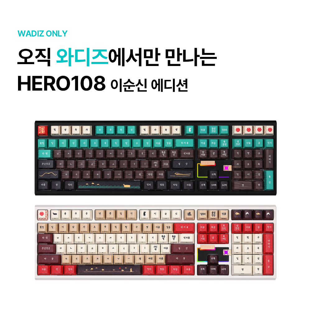 몬스타기어 HERO108 이순신 에디션은 숫자 패드를 포함한 108키 풀배열 구조를 채택한 하이엔드 커스텀 키보드다. 고품질 알루미늄 소재를 정밀 가공해 타건 시 발생하는 통울림과 뒤틀림을 물리적으로 억제했다. 금속 특유의 무게감을 통해 타건 안정성을 확보한 것이 특징이다. 한국의 역사적 인물인 이순신 장군을 모티프로 시각적 요소를 투영했으며, 커스텀 규격을 준수하여 내부 스위치 및 키캡의 교체 편의성을 갖췄다.
