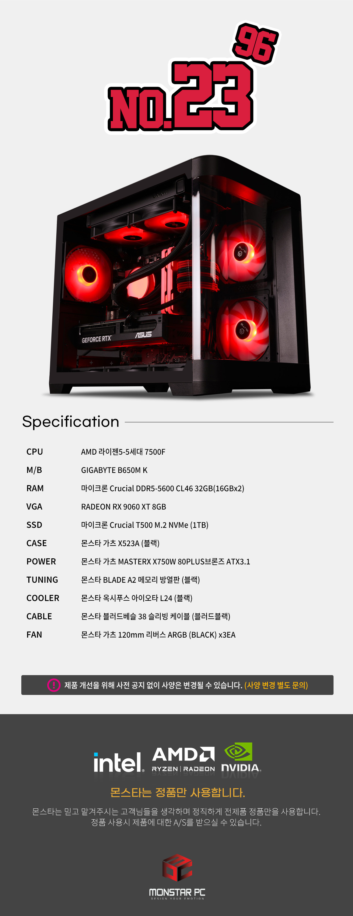 [무이자12개월] 몬스타 가츠 AMD 7500F RX9060XT(8GB) 32G 조립 게이밍 컴퓨터 NO.23 96