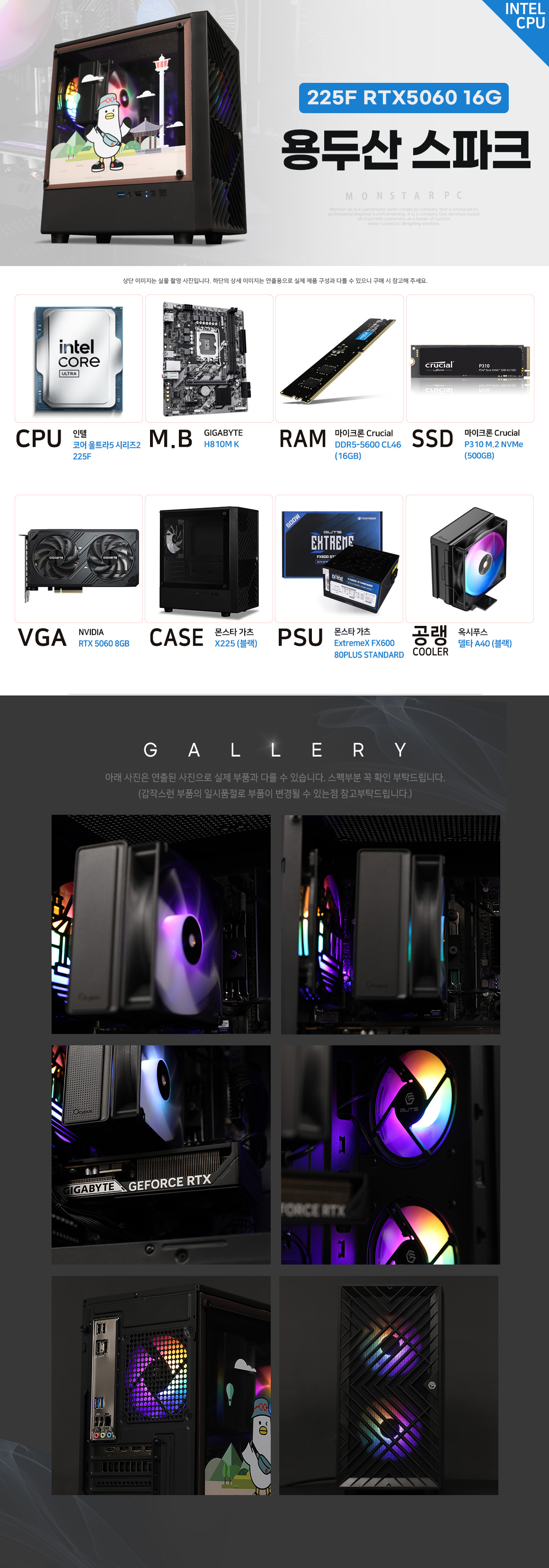 몬스타 가츠 울트라5 225F RTX5060 16G 게이밍 컴퓨터 용두산 스파크-즉시출고 이벤트 (선착순1대)