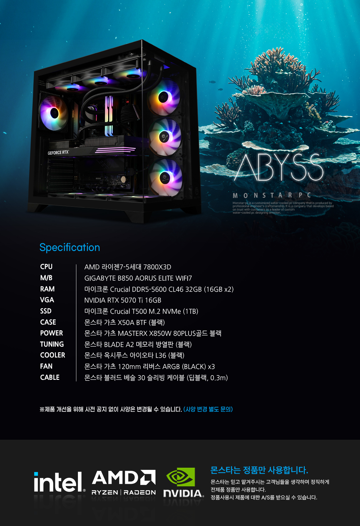 몬스타 PC AMD 7800X3D RTX 5070 Ti 32G 게이밍 컴퓨터 어비스 - 즉시출고 이벤트 (선착순 1대)