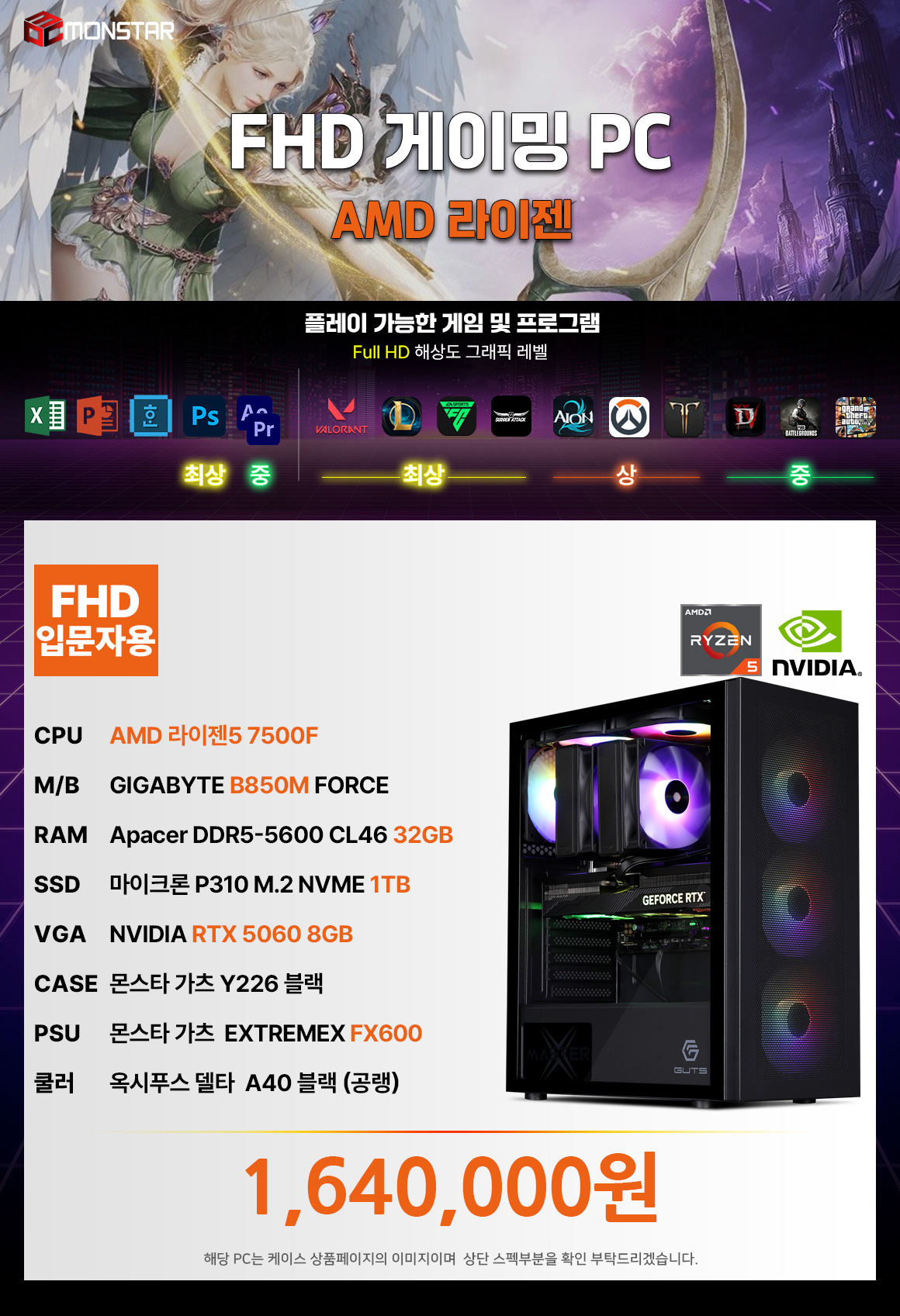 몬스타 PC AMD 7500F RTX5060 32GB 아이온2 FHD 입문자용 게이밍 컴퓨터 1번
