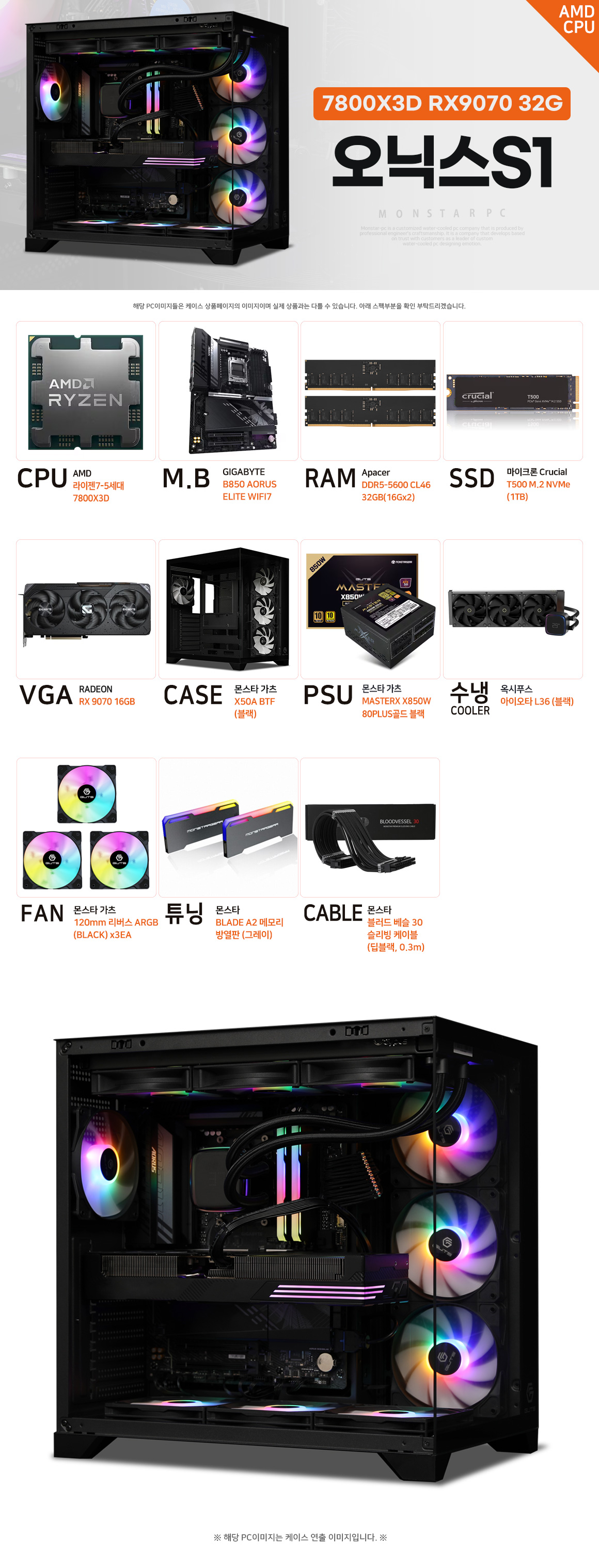 몬스타 PC AMD 라이젠7 7800X3D RX9070 32G 아이온2 게이밍 컴퓨터 오닉스S1 - 특가