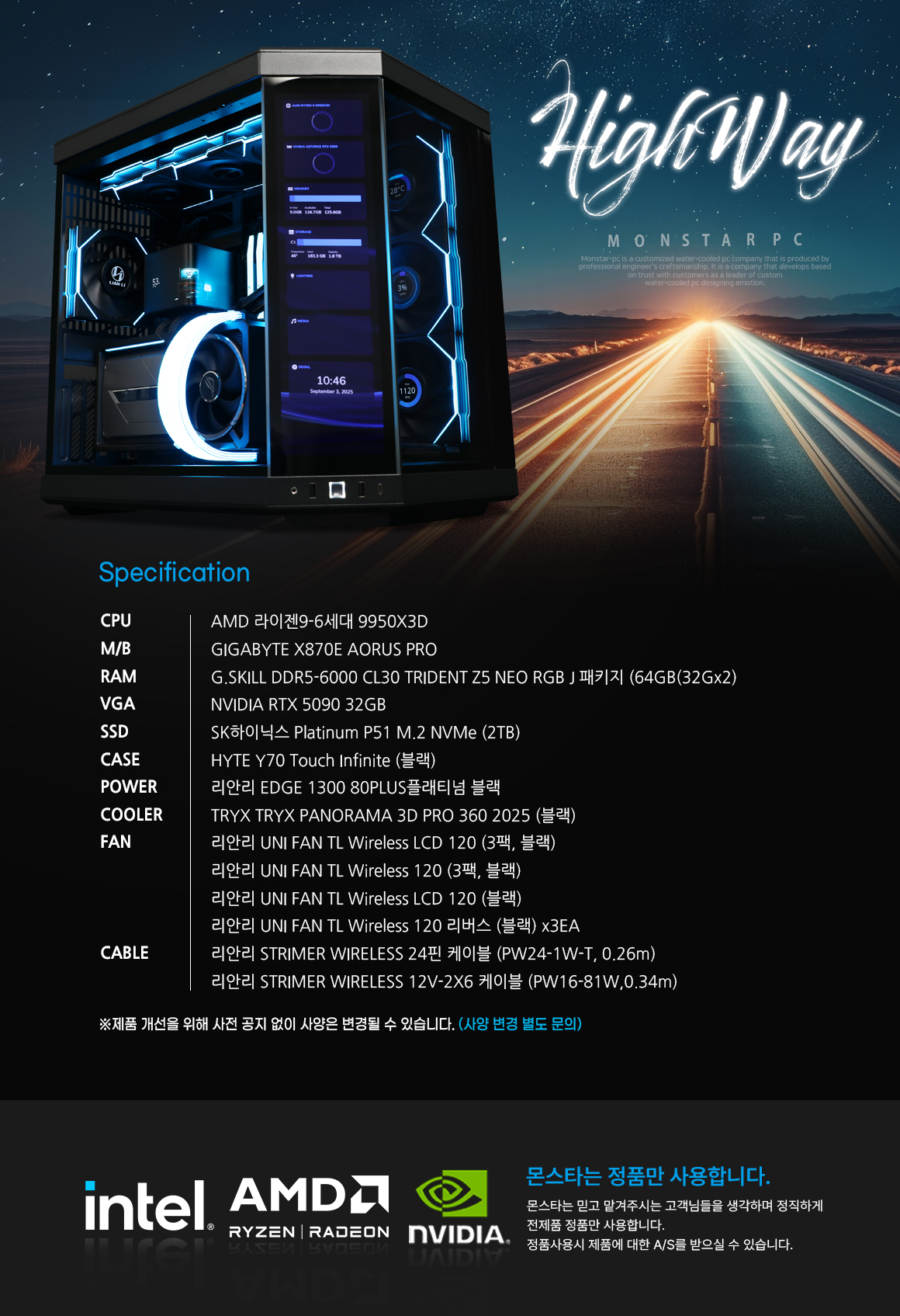 몬스타PC 라이젠9 9950X3D RTX 5090 64G 게이밍 컴퓨터 하이웨이