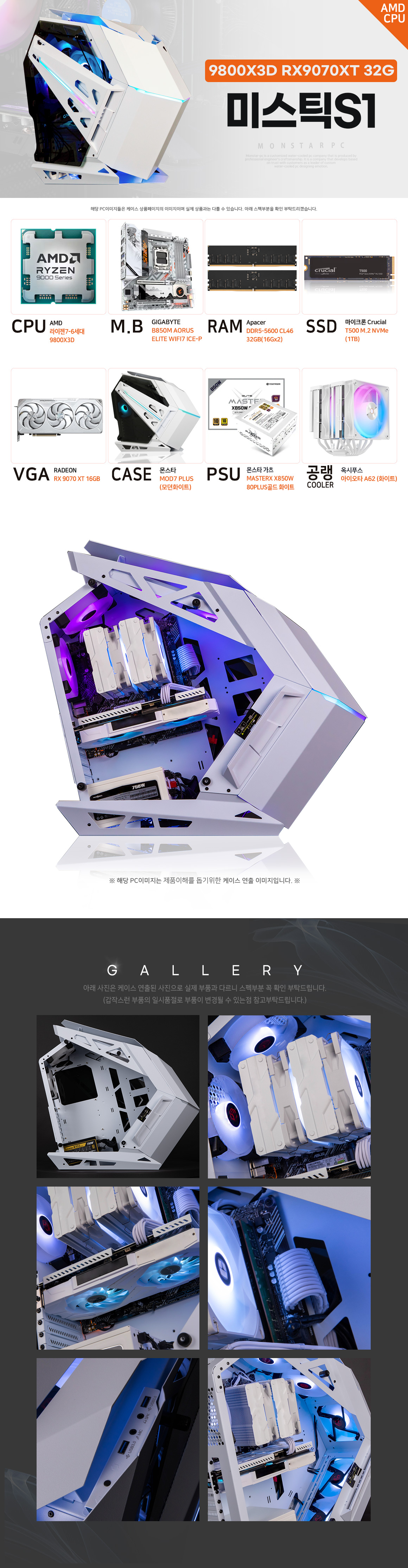 몬스타 PC AMD 라이젠7 9800X3D RX9070XT 32G 아이온2 게이밍 컴퓨터 미스틱S1