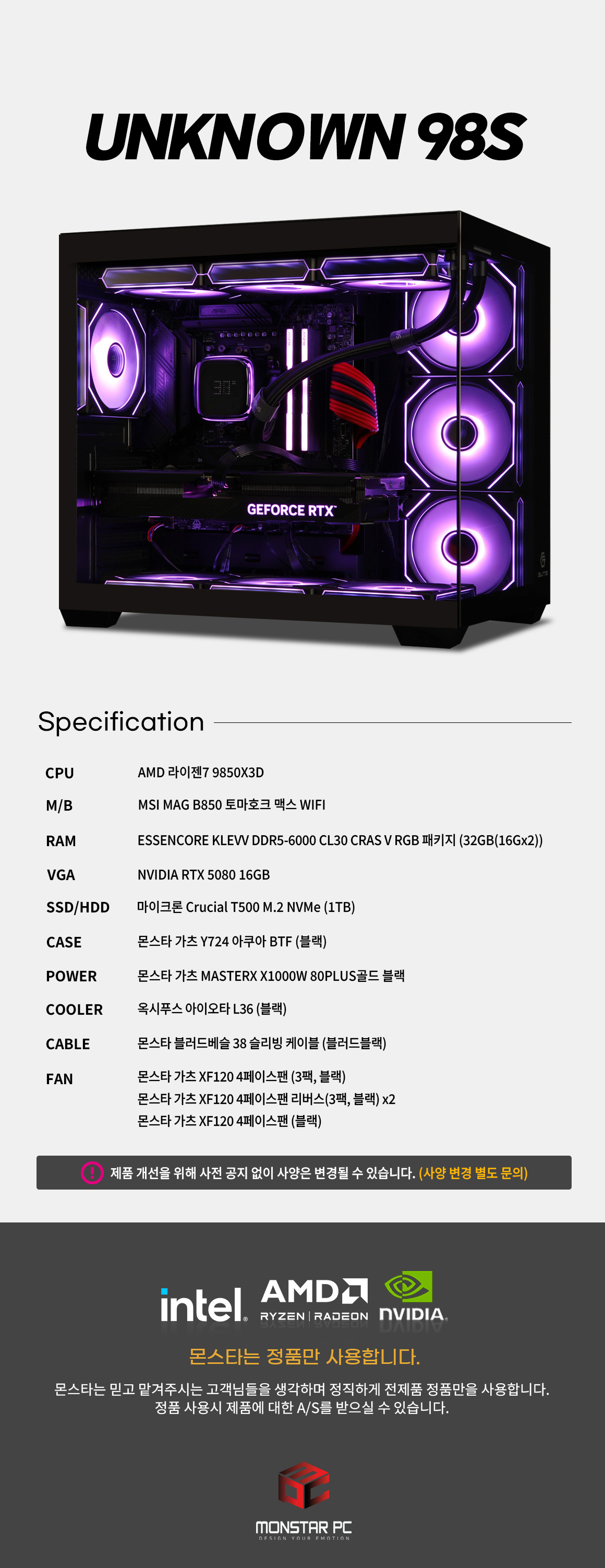 몬스타 가츠 AMD 9850X3D RTX5080 32G 4K 게이밍 PC 언노운98S