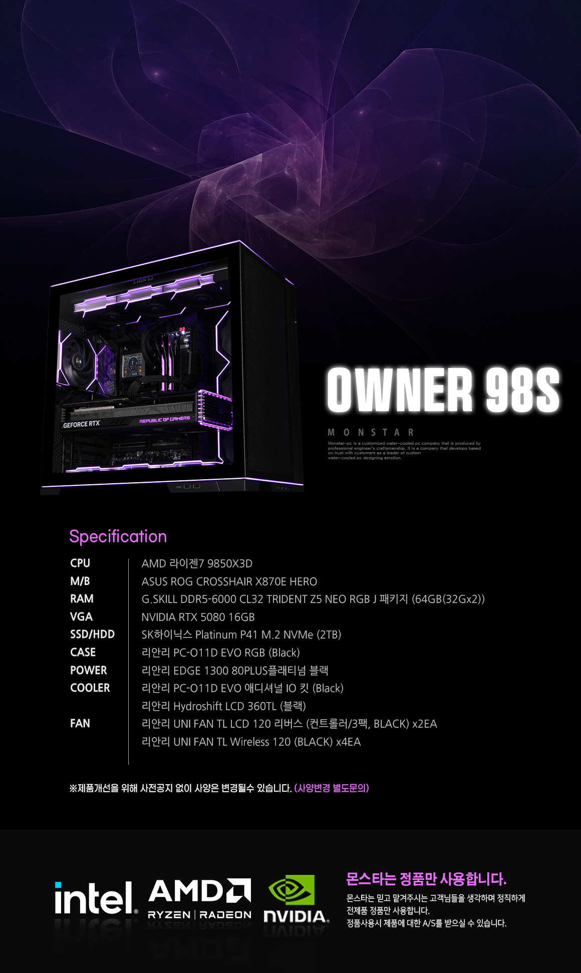몬스타 PC AMD 라이젠7 9850X3D RTX 5080 64G 게이밍 컴퓨터 오너98S