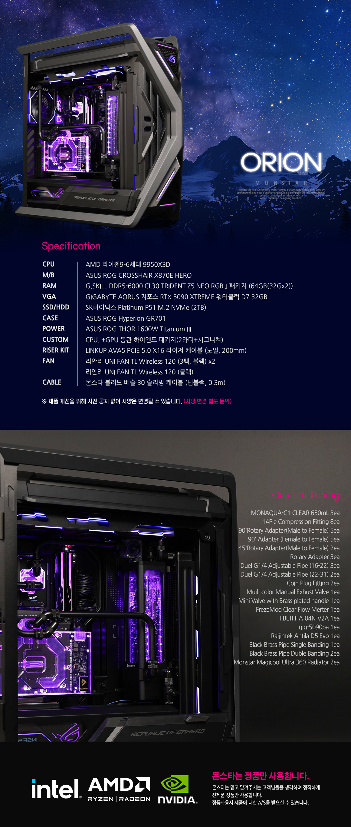 몬스타PC AMD 9950X3D RTX5090 64G 고사양 커스텀수냉 컴퓨터 오리온
