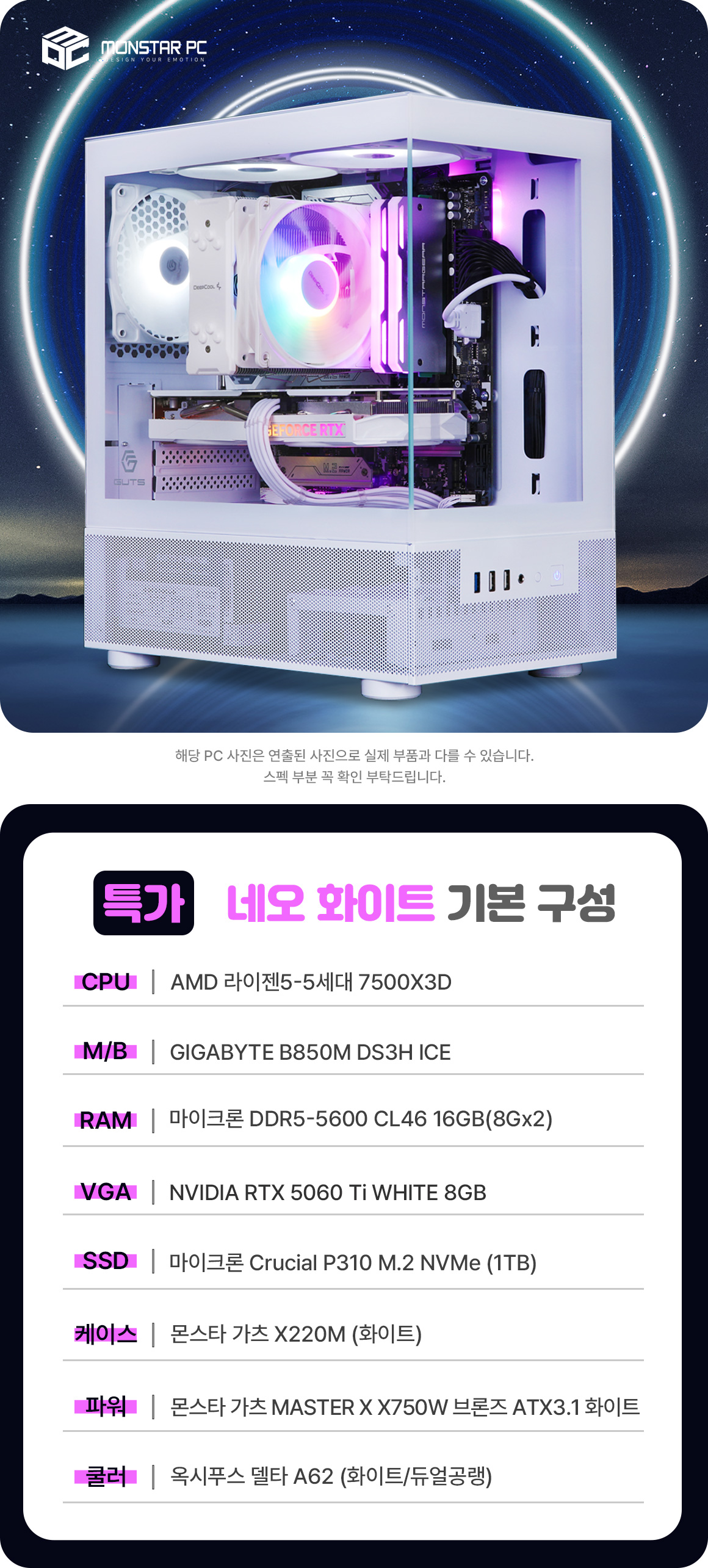 [특가] 몬스타 PC AMD 라이젠5 7500X3D RTX 5060 Ti 16G 게이밍 컴퓨터 네오 화이트