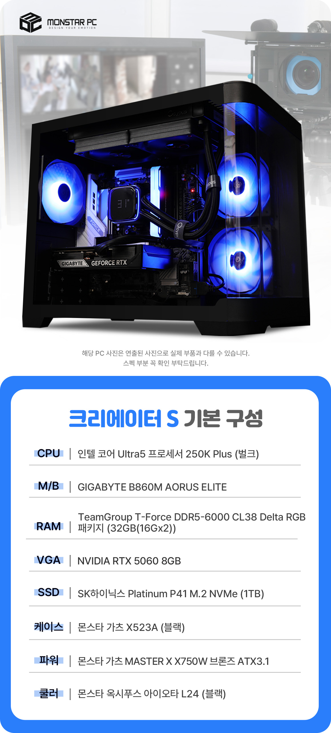 몬스타 PC 인텔 코어 울트라5 프로세서 250K Plus RTX 5060 32G 영상편집 디자인용 크리에이터S