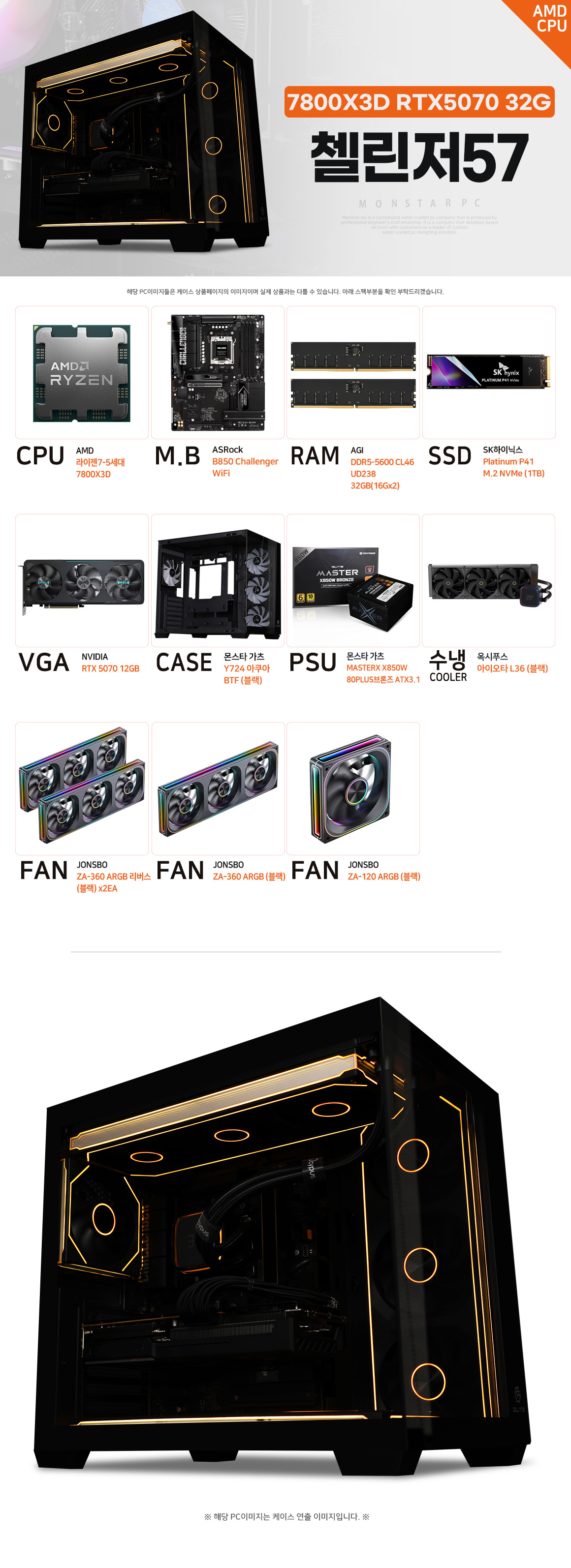 몬스타 PC AMD 7800X3D RTX 5070 32G 붉은 사막 사양 게이밍 컴퓨터 첼린저57