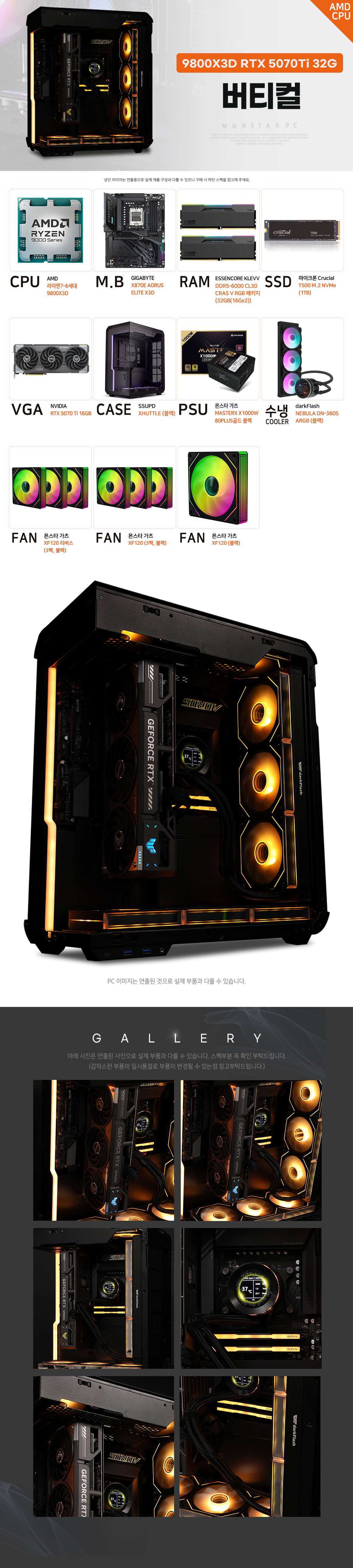 몬스타 PC AMD 라이젠7 9800X3D RTX 5070 Ti 32G 게이밍 컴퓨터 버티컬